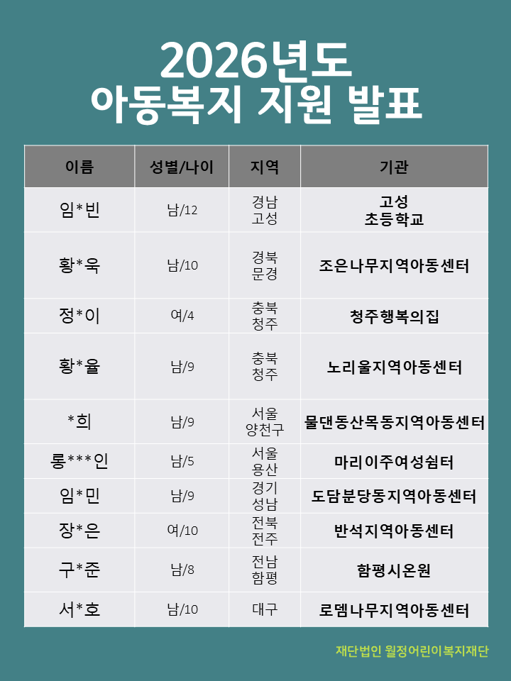 필요한 최소한의 생계비를 지원하는 [아동복지 지원] 2026년도 대상자를 선정하였습니다.